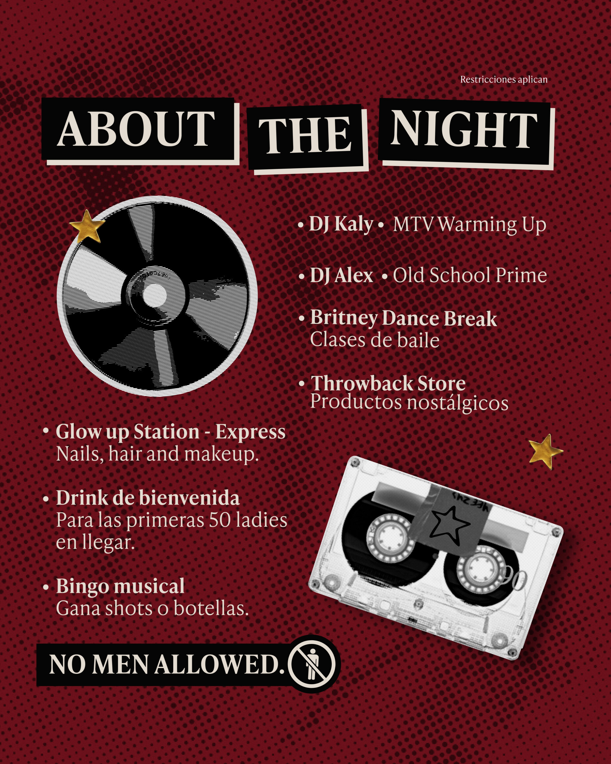 Y si eso no fuera suficiente, la noche incluye una clase de baile con Britney Dance Break, para que ese instinto que siempre tuviste finalmente tenga escenario. También habrá Bingo Musical — una dinámica donde la nostalgia se convierte en premios reales: shots y botellas para las ganadoras.